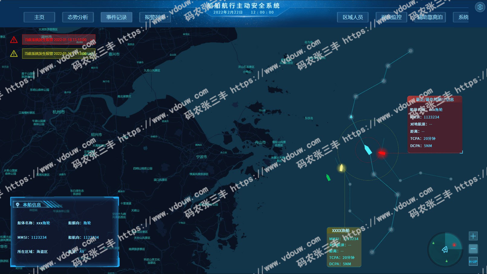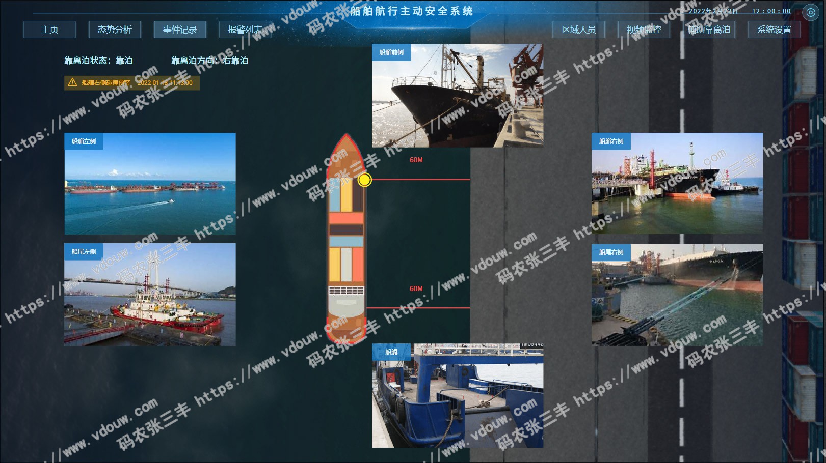 船舶行为主动安全系统是对船舶航行中船舶状态、人员操作进行感知并预警的系统,通过AR/VR视觉和信息融合主要实现以下功能:船舶航行安全:辅助避碰,整合AIS,GPS数据航线规划;人员安全:行为感知和判定功能;人员管理:人员在岗、健康、安全帽和行为识别;AI视觉:全景视频监控和基于AI的状态识别;报警管理:实时报警、报警统计和分析等;辅助靠离泊:毫米波雷达,船舶辅助停泊;大数据看板:综合显示船舶信息。