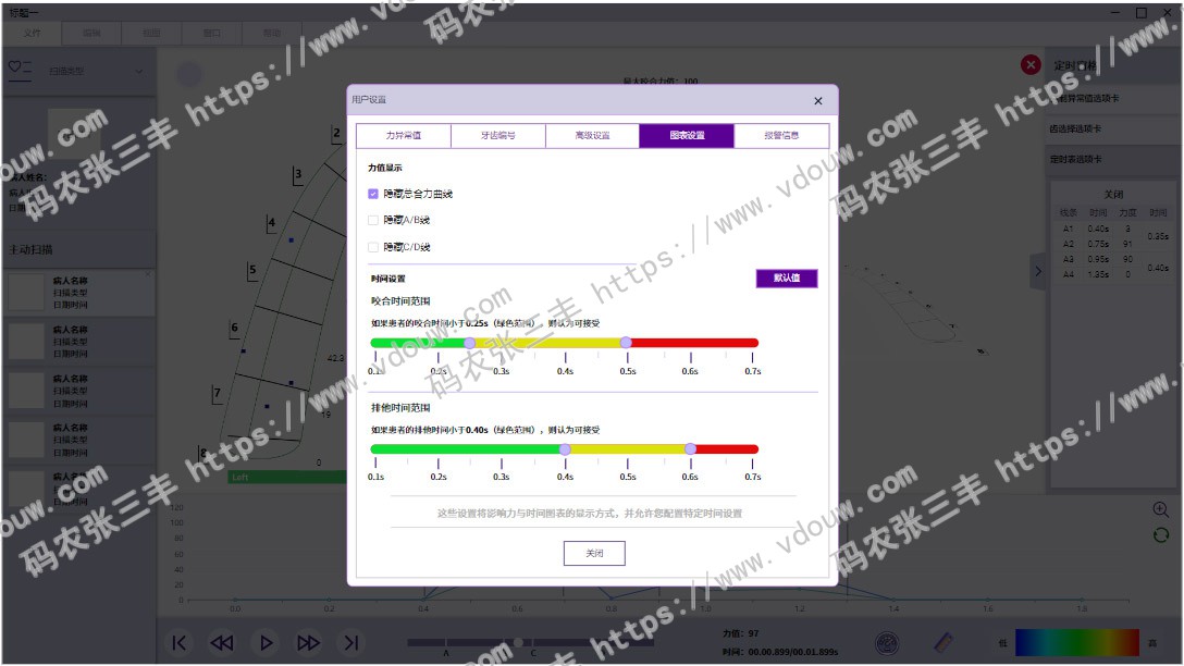 正时窗格:量化显示咬合时间参数、单齿时间数据及异常力值。